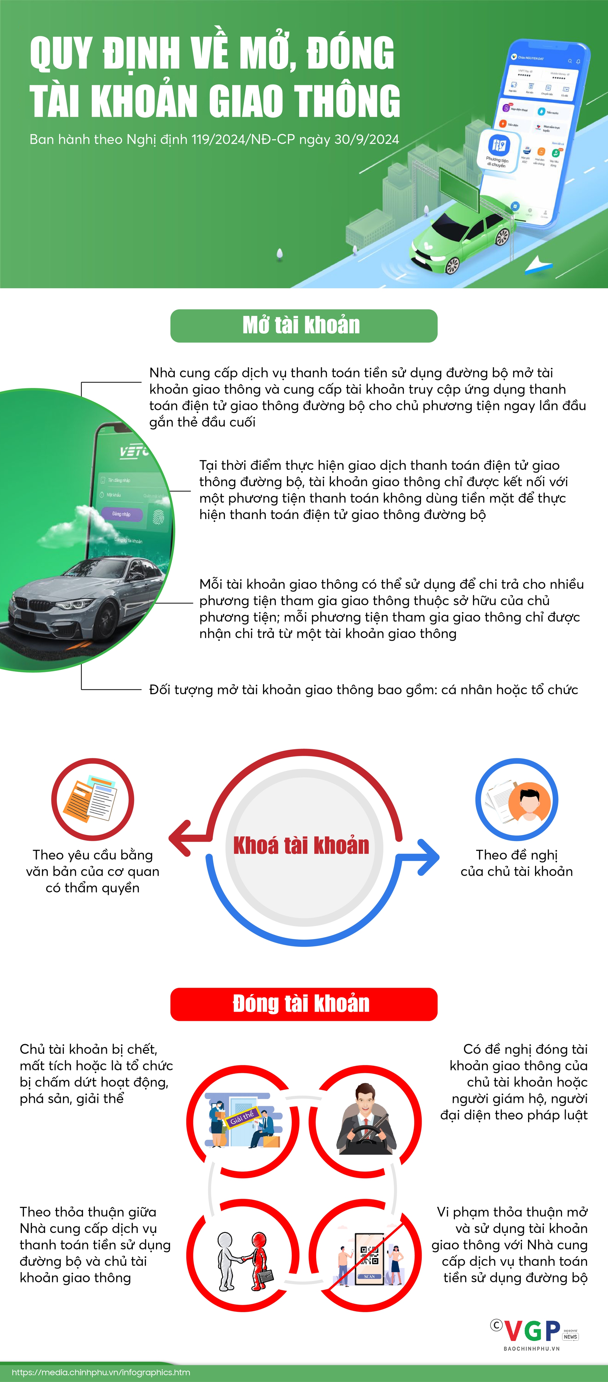 (Chinhphu.vn) - Tại Nghị định 119/2024/NĐ-CP quy định về thanh toán điện tử giao thông đường bộ, Chính phủ nêu rõ quy định về mở, sử dụng, khóa tài khoản giao thông.