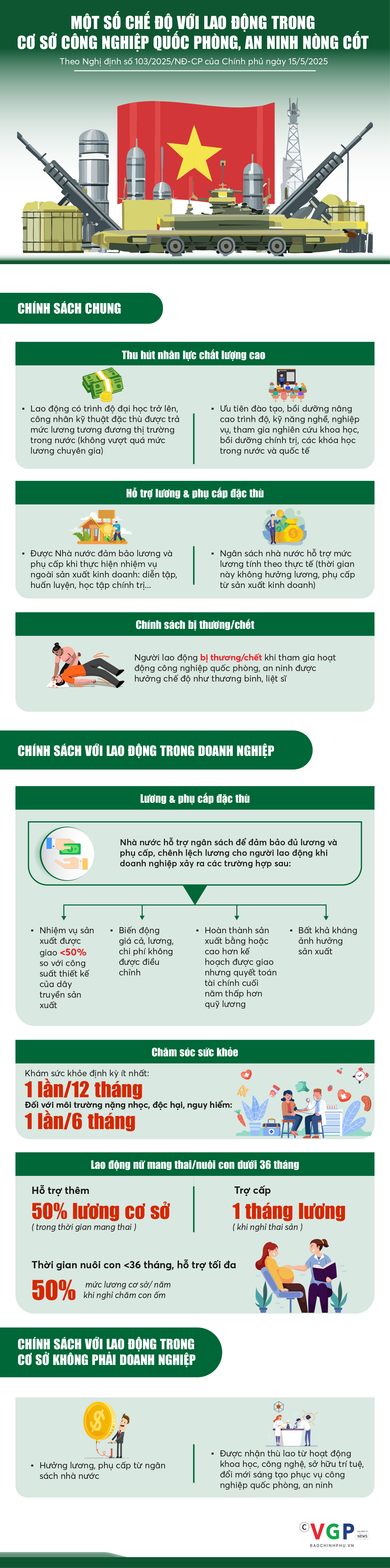 (Chinhphu.vn) - Nghị định số 103/2025/NĐ-CP của Chính phủ quy định một số chế độ, chính sách đối với người lao động trong cơ sở công nghiệp quốc phòng, an ninh nòng cốt.